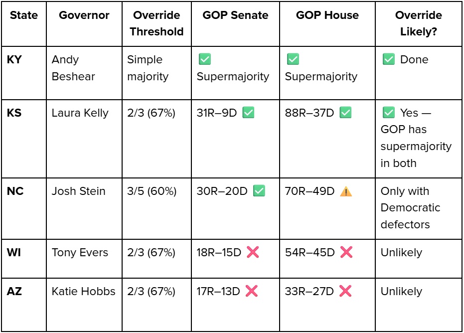 Kentucky's override was clean: a simple majority threshold, supermajorities in both chambers. Wisconsin and Arizona aren't realistic override candidates under their current compositions. North Carolina is contested; Republicans have the Senate supermajority but are two seats short in the House, meaning they'd need at least two Democratic defectors.