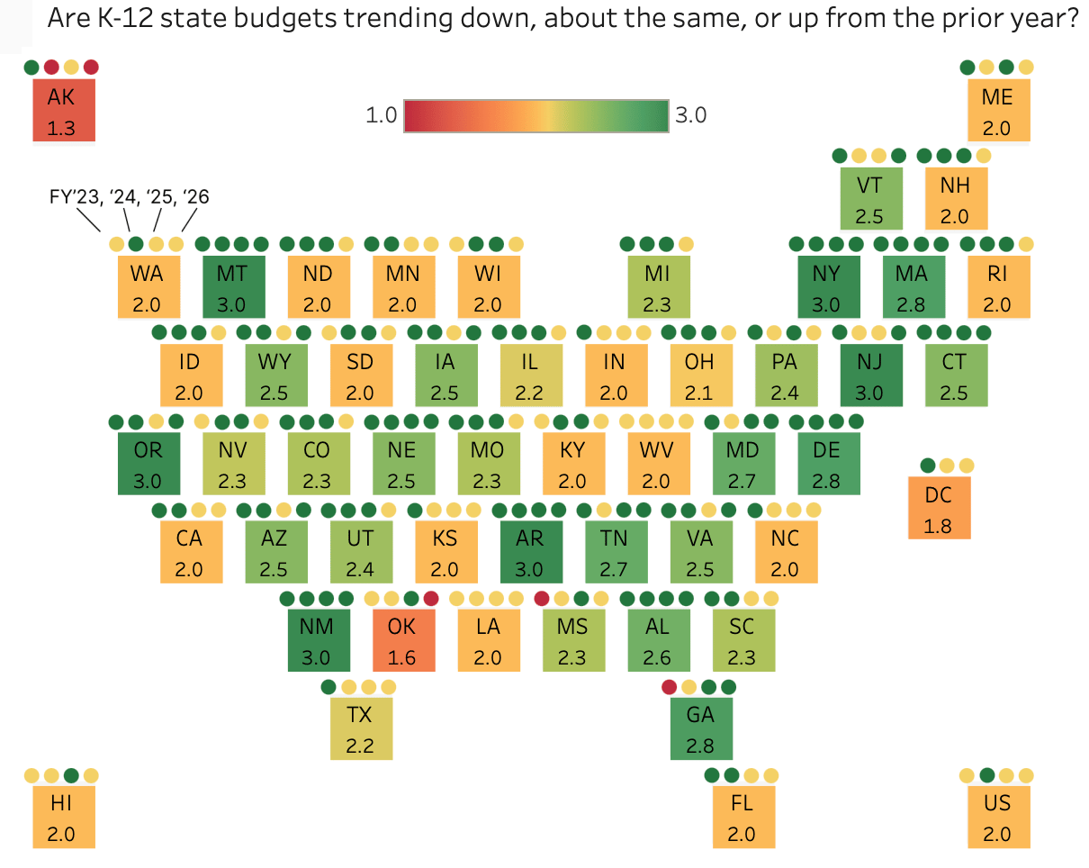 The map shows whether state education budgets are down (red), level (yellow), or green (up) over the prior year. Budget trends are scored 1 to 3. “1” is declining. “3” is improving.” “2” is level or marginal changes that may be washed out by rising costs. Scores are fractional because there are various parts of K-12 funding with scores.