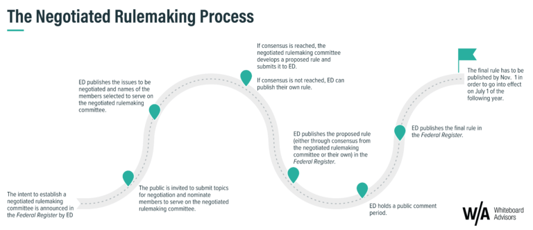 This chart is titled “The Negotiated Rulemaking Process.” Pictured is a grey roadway marked by teal GPS pins leading to a teal finish line flag to illustrate the legislative process.